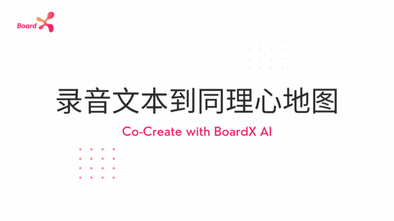这个动画展示了 BoardX 的“语音转文字”AI 功能如何在设计思维工作流中帮助你捕捉灵感:当团队成员在头脑风暴或用户访谈中口述想法时,录音下来,上传到Board并生成在白板上的文本。以便为后续的文字分析作准备。