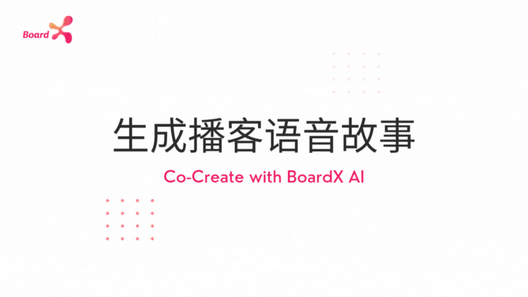这个动画展示了 BoardX 的“生成播客语音故事(Generate Podcast Story)”AI 功能如何在设计思维的传播与分享阶段助力团队:当你在白板上整理好洞察、用户旅程或原型要点后,只需一键触发,系统便会自动将这些内容转换成连贯的播客脚本和标准音频格式——包括引人入胜的开场白、分段讨论主题、案例讲述、过渡语及总结结尾。AI 同时会为每个段落推荐适合的语气、配乐和音效,并生成完整的节目录制脚本与元数据(如 show notes、章节标记)。通过这一功能,团队能够快速将设计思维成果转化为可发布的音频故事,既增强了知识传递的趣味性,也扩展了影响力,让创意和洞察触达更广泛的受众。