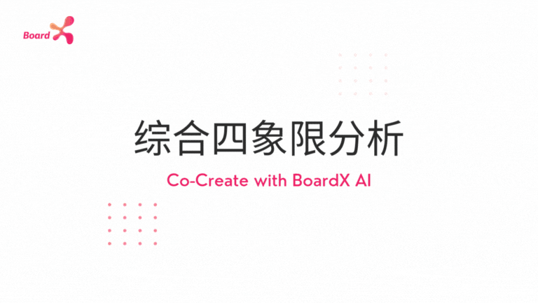 这个动画展示了 BoardX 的“综合四象限分析(Four Quadrant Analysis)”AI 功能如何在设计思维的评估与决策阶段助力团队:系统会自动提取白板上已聚类或分类的便签内容,根据预设的双重维度(如影响力 vs. 可行性、价值 vs. 成本等),智能计算并将每条便签精准地分配到四个象限中,同时为每个象限生成标题与可视化图示。通过一键生成的四象限图,团队能够直观地看到各类创意或需求在不同维度下的分布,快速识别高价值高可行项、需谨慎观望项、低优先级可后置项等,从而高效地制定优先级和行动计划,推动设计思维从洞察到落地更具方向性与执行力。