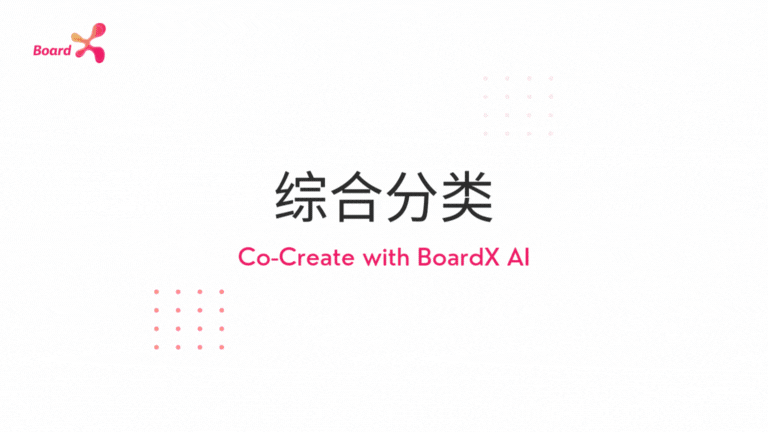 这个动画展示了 BoardX 的“综合分类(Clustering)”AI 功能如何在设计思维的聚合阶段助力团队:系统会自动读取白板上散落的便签或文本框,基于内容相似度和关键词匹配,将它们智能分组并生成可视化的类别簇,每个簇都配有标签和色彩标识。通过一键聚类,团队无需手动拖拽或重命名,即可快速完成亲和图谱(Affinity Diagram)的整理与分析,发现主题模式和隐含关联,帮助你更高效地聚焦关键洞察并为接下来的“定义”与“原型”阶段奠定坚实基础。