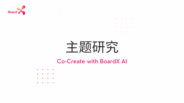 这个动画展示了 BoardX 的“主题研究(Research on Topic)”AI 功能如何在设计思维的探索阶段助力团队:当你在白板上输入一个研究主题或关键词后,系统会自动从内部文档库、网络资源或导入的报告中抓取相关信息,利用自然语言处理技术提炼出核心观点、趋势数据和竞品洞察,并将它们以摘要、图表和便签的形式可视化地呈现在白板上。通过一键完成的主题研究,团队能够快速获得全面、结构化的背景资料,建立对问题域的深刻理解,为后续的“定义”与“构思”阶段奠定坚实基础,显著提升调研效率和决策质量。